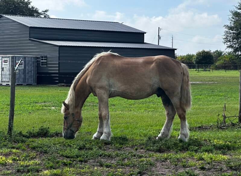 This BIG guy is truly a gentle giant. Standing at 17.2 hands he made even taller humans look small. A Belgian draft to be precise about his breed. When he came to the farm he was quite thin and his hooves were in terrible condition. A couple visits from a patient farrier and they started to look brand new. Rocky was adopted out to a loving couple looking for a horse of his stature. He is doing well and we loved having him as a member of our farm.